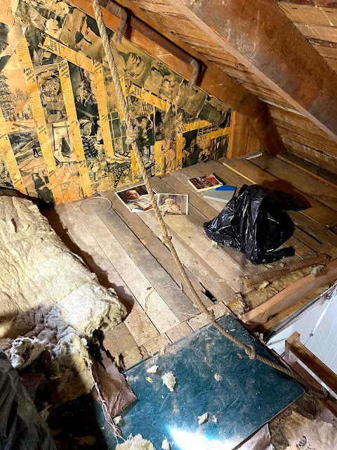 Hela vinden är täckt av isolering och bråte. Väggarna är täckta av tidningspapper.